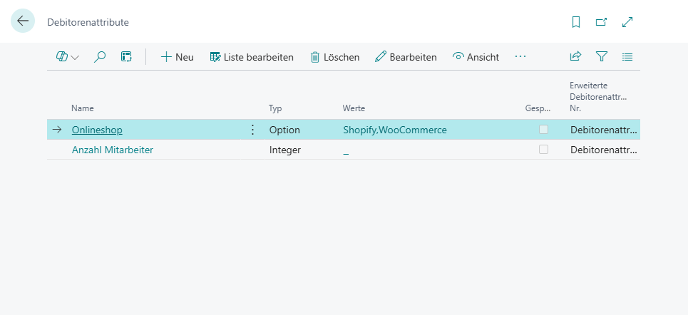 → Hier können neue Attribute definiert werden, z. B. Typ Option für „Yes or No“ oder Typ Integer für „Anzahl Mitarbeiter“.In der Debitorenkarte erscheint im unteren Bereich der Abschnitt Debitorenattribute.