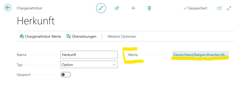 → Beispiele: Herkunft (Typ Option: Deutschland, Belgien, Mexiko, etc.), Geprüft (Typ Option: Ja/Nein).In der Chargennr.-Informationskarte wird der Abschnitt Chargenattribute angezeigt.