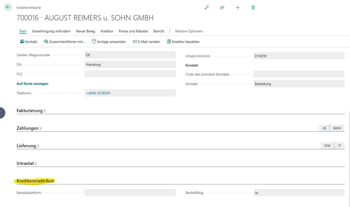 → Beispiel: Bestellplattform (Typ Text) oder Bestellfähig (Typ Option, Werte: Ja/Nein).In der Kreditorenkarte wird der Abschnitt Kreditorenattribute angezeigt.
